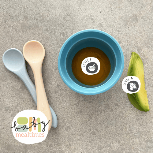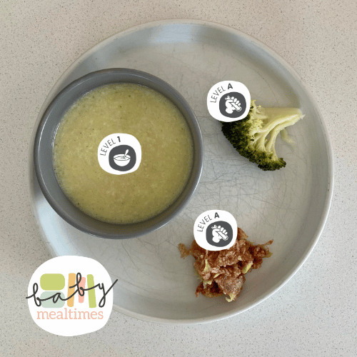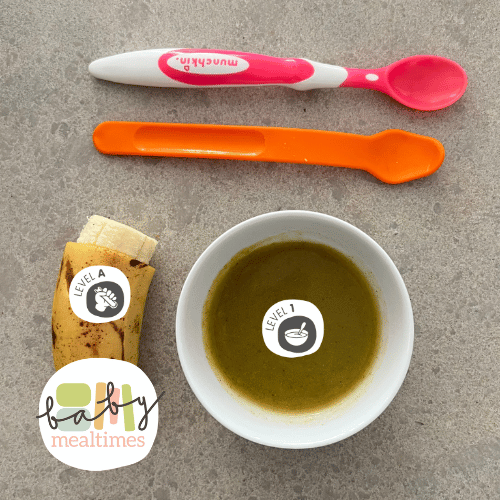 Here are some examples of meals you could offer your baby early on that combine puree and finger foods. We share more examples like this, as well as go into more detail in the Baby Mealtimes membership.